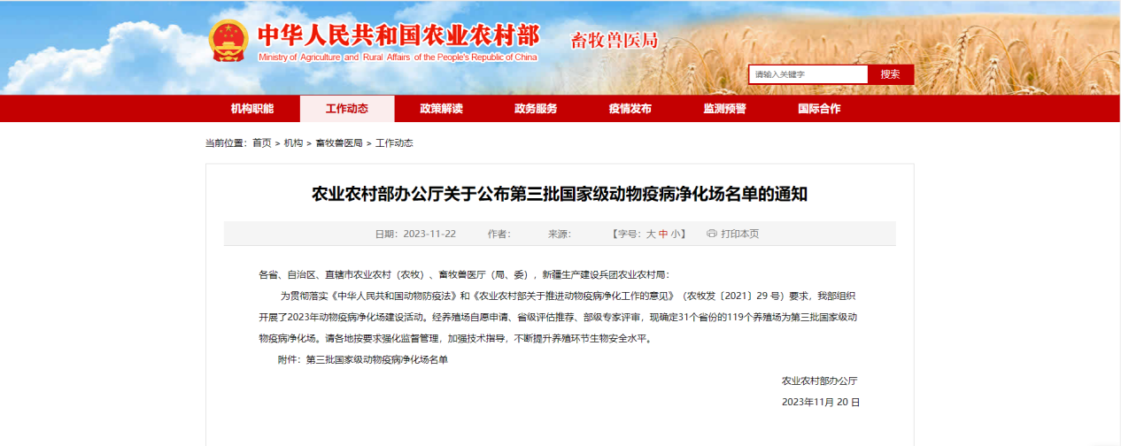 11月20日,農(nóng)業(yè)農(nóng)村部辦公廳發(fā)布第三批國家級動物疫病凈化場名單(農(nóng)辦牧﹝2023﹞29號),我司經(jīng)部級專家評審,被評為國家級羊布魯氏菌病(非免疫)凈化場。